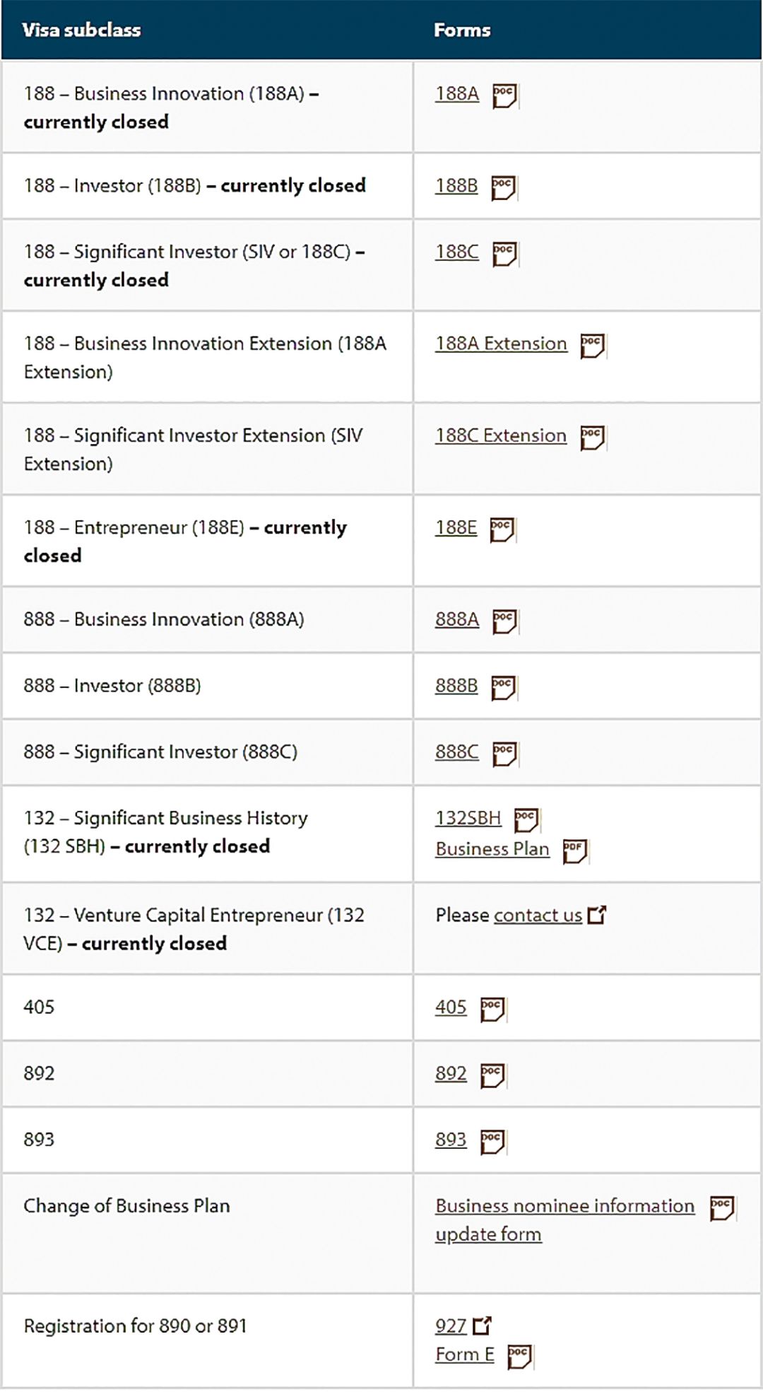 188A類 –商業創新類移民、188B類 –投資者類移民、188C類 –顯赫投資者移民、188E類 –企業家移民、及132 類別。