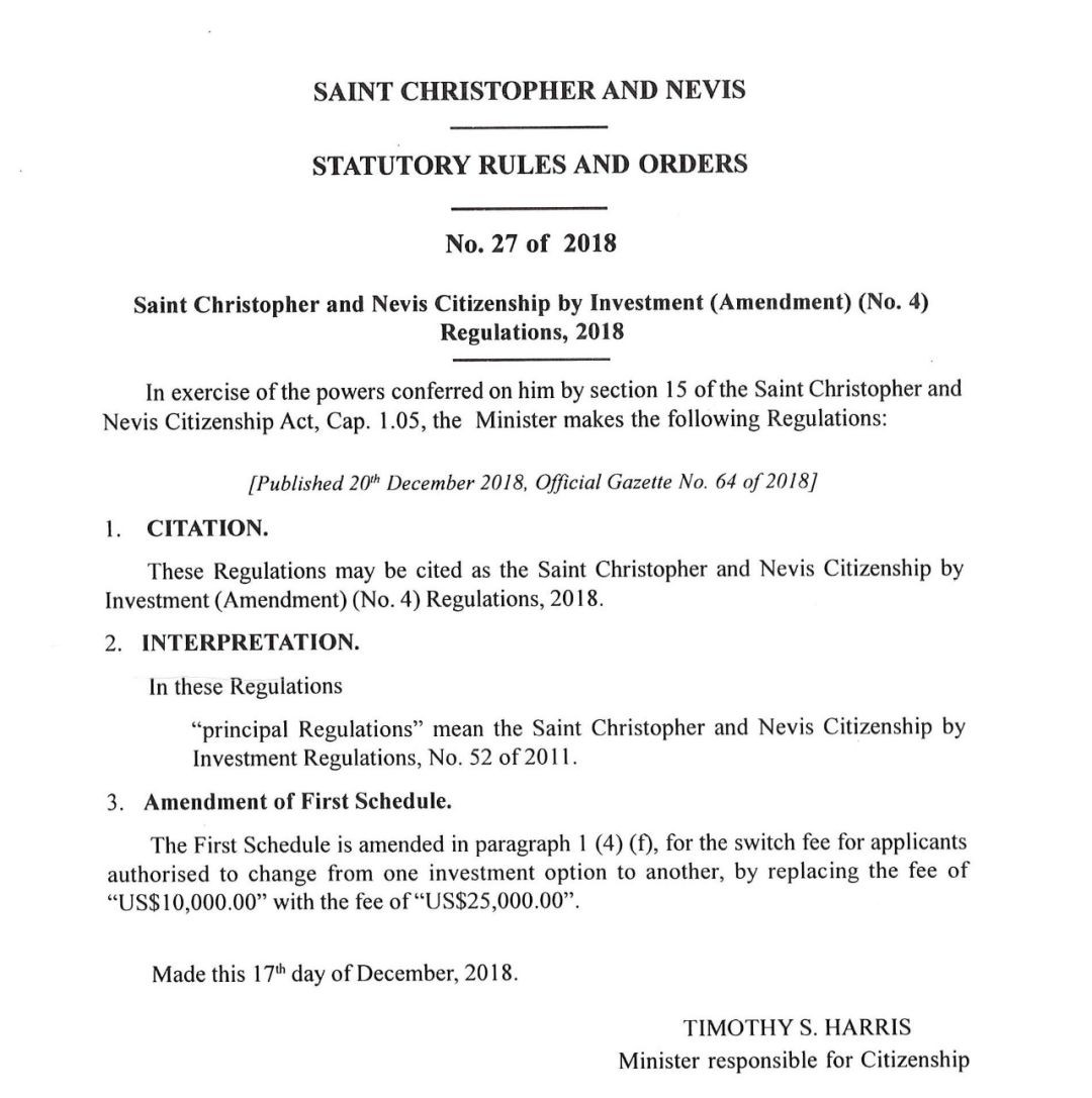 聖基茨·尼維斯總理哈里斯此前曾宣布,該國的投資移民計劃需要修改一些費用細則。近日,聖基茨·尼維斯正式發布通告,房地產投資與捐款投資之間的轉換費用將由以前的10000美元上漲為25000美元。