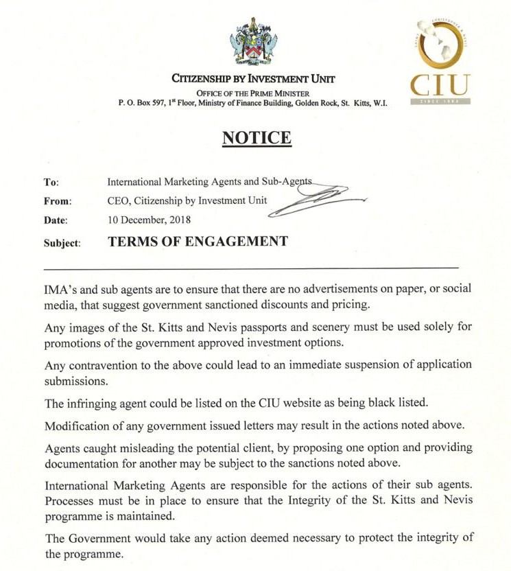 針對上月出現的一些負面新聞,聖基茨·尼維斯官方列出一份投資黑名單,其中包括投資者及CIP代理商,其中涉及代理商以低於法定許可價格進行的虛假宣傳以及部分不合格的投資者。聖基茨·尼維斯投資移民部發布聲明:「違反規定的行為可能導致該國暫停投資移民申請,侵權代理人會被列入聖基茨·尼維斯列入黑名單。」