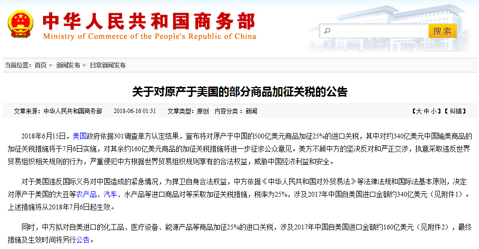 2018年6月15日,中國商務部公布對美國加征關稅的反制措施。