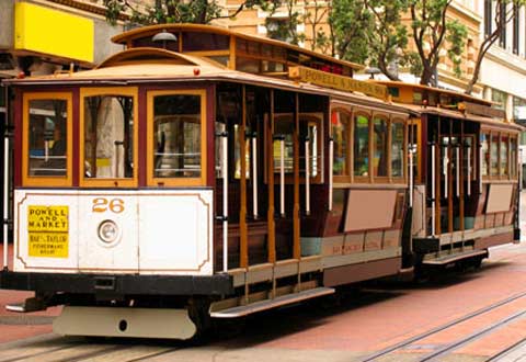 1869年,在看到马在湿鹅卵石地上,沿着旧金山陡峭的杰克逊大街,艰难地拉着马车前进的时候,发明家安德鲁·史密斯·哈乐迪(Andrew Smith Hallidie)灵光一闪,想到了一个蒸汽动力、缆索驱动的铁轨系统。四年后,旧金山的第一辆缆车开始在马路上行驶。游客可以在免费开放的缆车博物馆查看第一辆辆车,看看地下滑轮系统是如何工作的。或者也可以跳上一辆人工缆车,朝着当年的马前行的方向,行驶在杰克逊大街上。需要有两个人制动刹车,尤其是在陡峭的大街上。黄铜钟钟声响起之后,公共交通缆车上的二重奏总是为旅程增添不少趣味。