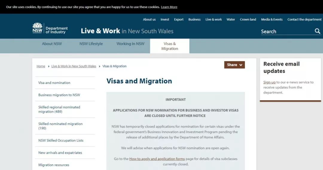 2018年12月18日下午,澳洲联邦政府宣布,暂停新南威尔士州(澳大利亚最大州,首府悉尼)所有商业及投资移民申请:包括188A创业投资类,188B投资类,188C重大投资者类,以及132天才企业家类移民签证州担保申请。