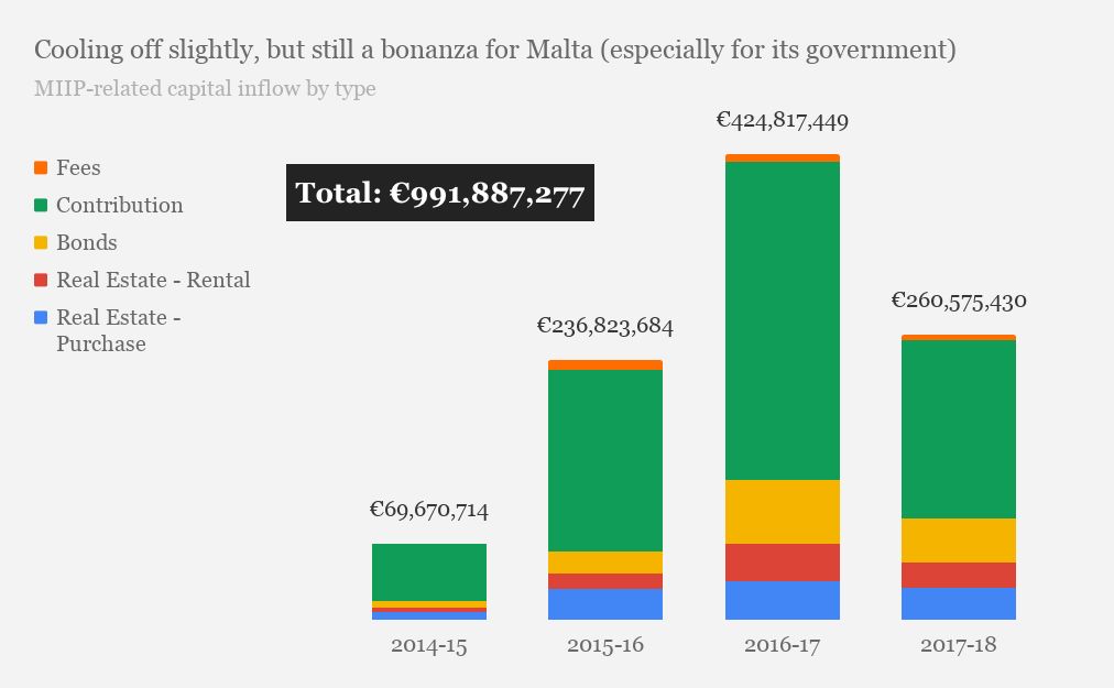 2017-2018年度相比2016-2017年度的收入,下降了39%。总体而言,马耳他自2015年开始对外发布该项目的报告后,2014-2018年间总收入约为9.9亿欧元,但是考虑到尚未公布的2014年上半年收入(MIIP项目自2014年成立)及2018年下半年收入,该计划产生的直接投资总额已超过10亿欧元。