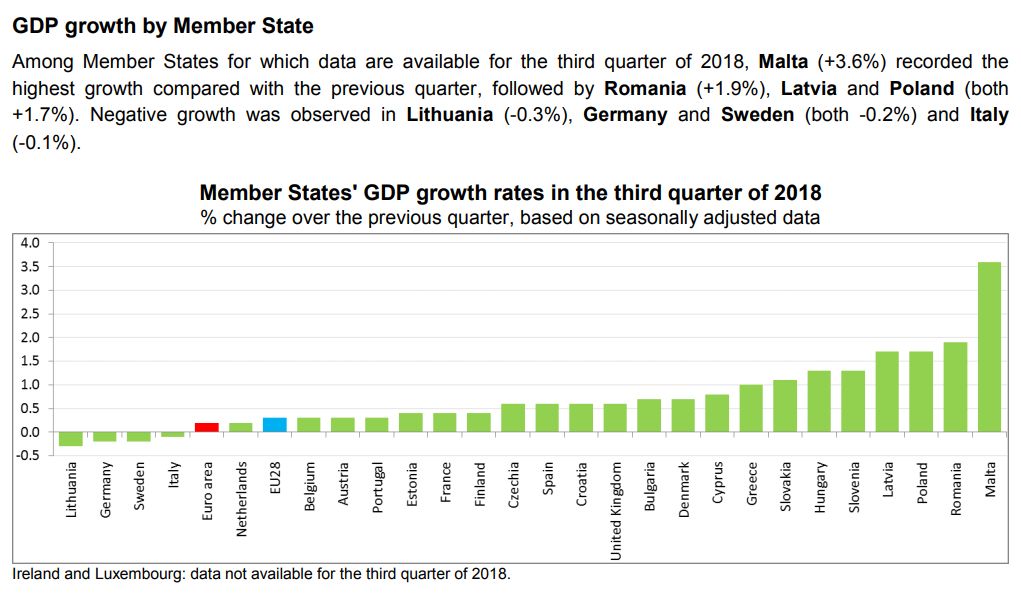 在2018年间,马耳他在欧盟28国的GDP和就业增长率最高。与去年同期相比,马耳他GDP增长率从第二季度的+ 6.2%增加到第三季度+ 7.9%,但欧盟28国的GDP增长率从第二季度的+ 2.1%降至第三季度的+ 1.8%。相对而言,马耳他的增长速度是欧盟28国的平均水平的四倍。