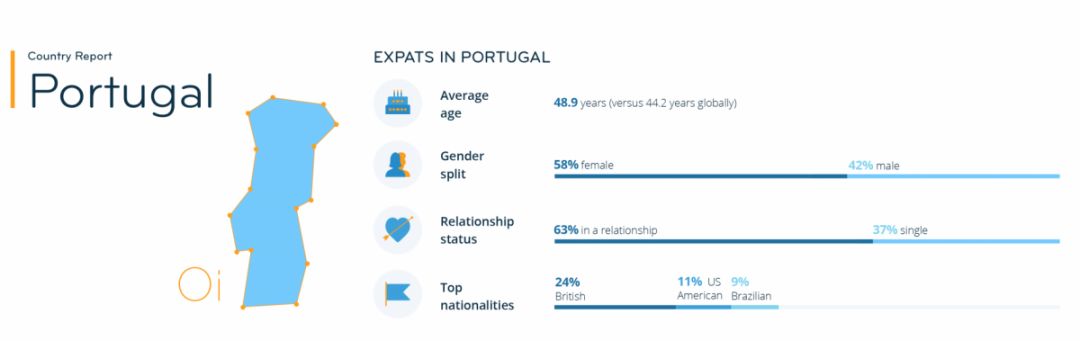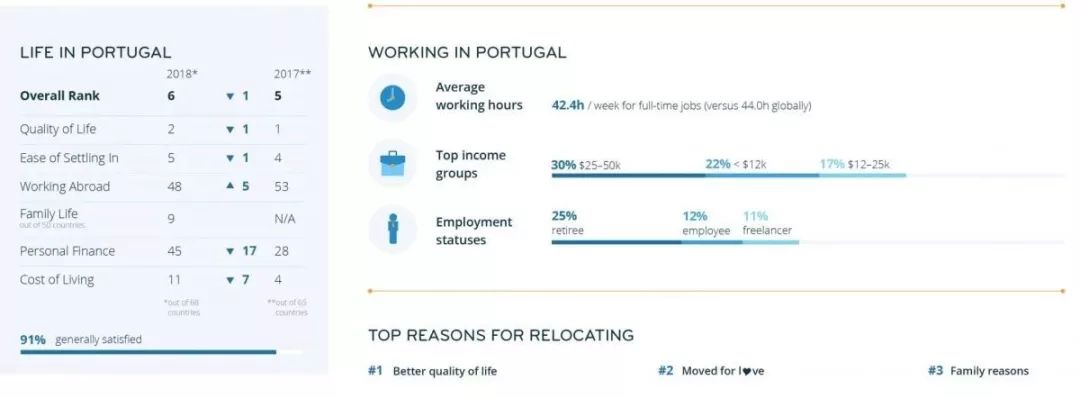 葡萄牙在外籍人士居住排名中获得第六名。其中包括第五位的住房便利性和第二位的生活质量。随着葡萄牙人们对生活质量的积极排名,近79%的外国人对葡萄牙当地的社交和休闲活动感到满意。94%的受访者都表示他们对气候和天气感到满意,葡萄牙温和的冬季和阳光明媚的夏季享誉世界。