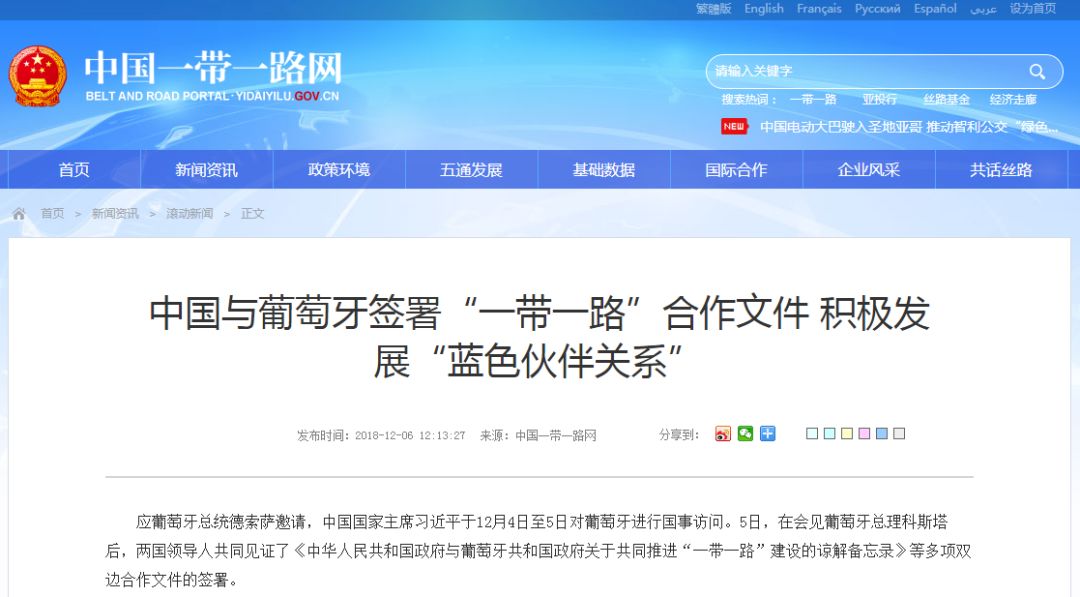 应葡萄牙总统德索萨邀请,中国国家领导人于12月4日至5日对葡萄牙进行国事访问。5日,在会见葡萄牙总理科斯塔后,两国领导人共同见证了《中华人民共和国政府与葡萄牙共和国政府关于共同推进“一带一路”建设的谅解备忘录》等多项双边合作文件的签署。